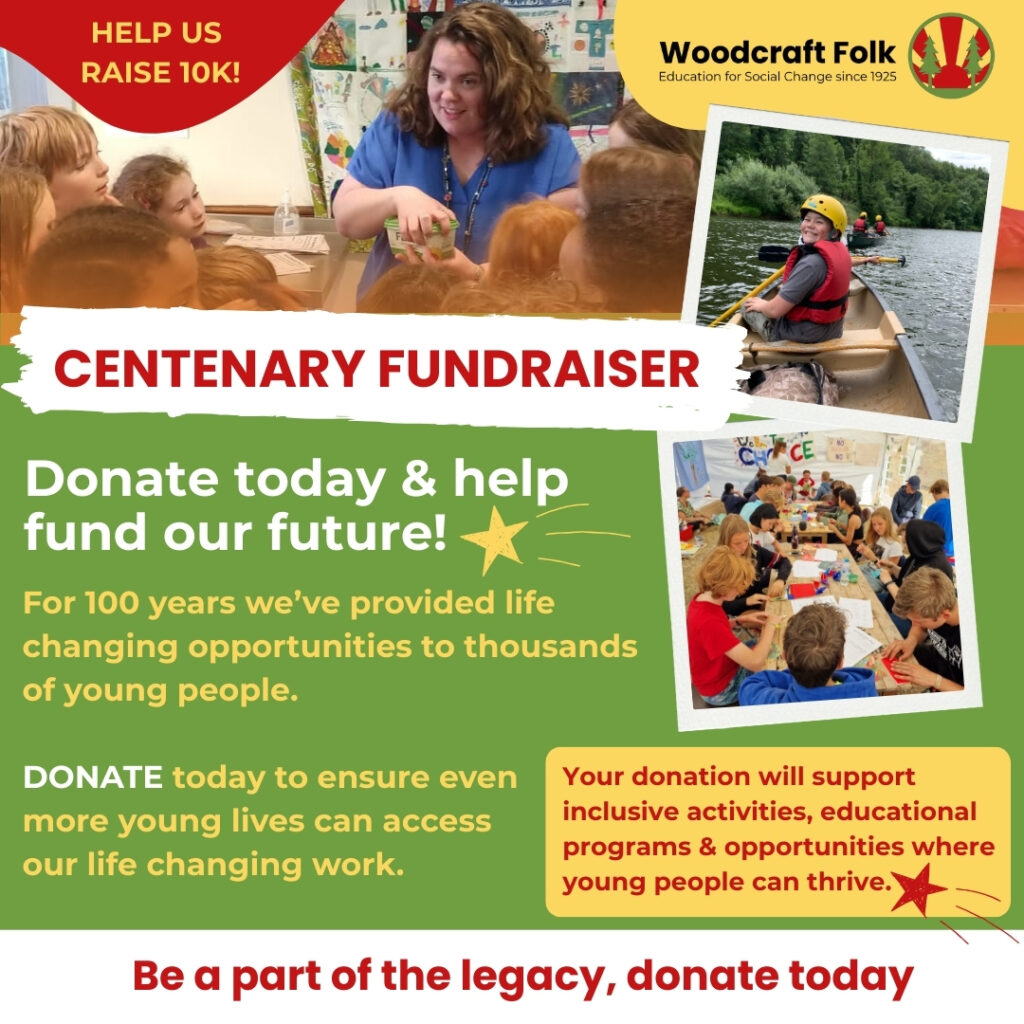 “ For a century, Woodcraft Folk has been more than an organization—it’s been a vibrant community where young people discover friendship, courage, and empowerment through outdoor adventures, social justice, and creative expression. Our centenary is more than a milestone – it’s an opportunity to recommit to the vision of education for social change that has driven us for a century. However, we can’t do it alone, we need your help to ensure our legacy continues. A donation to our fundraiser will directly support inclusive activities, educational programs, and opportunities for young people to thrive for years to come.”