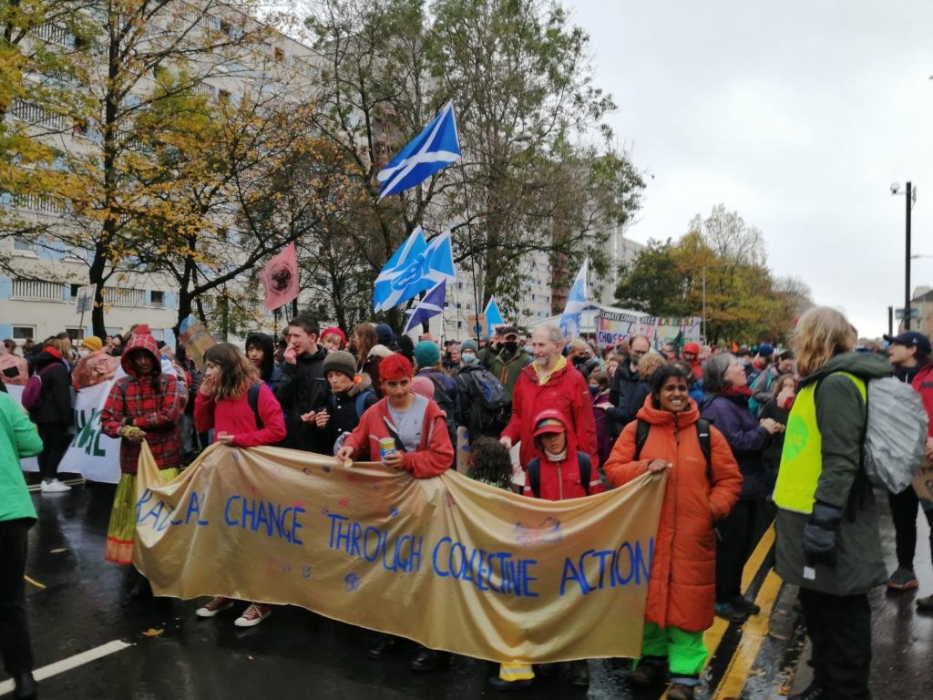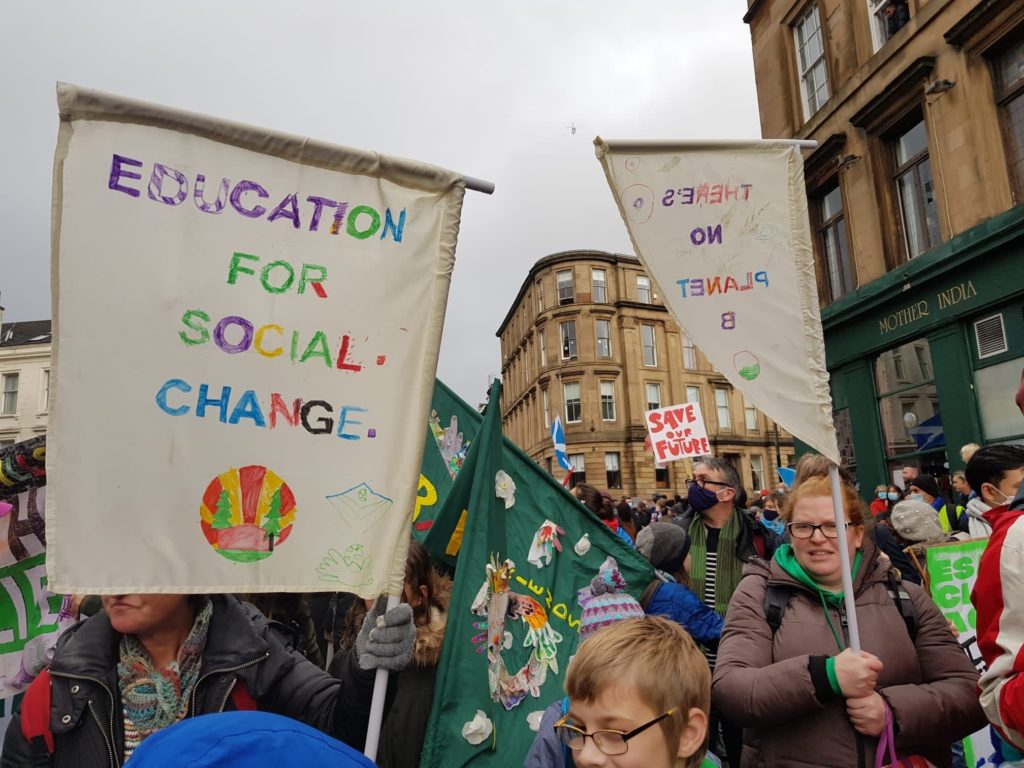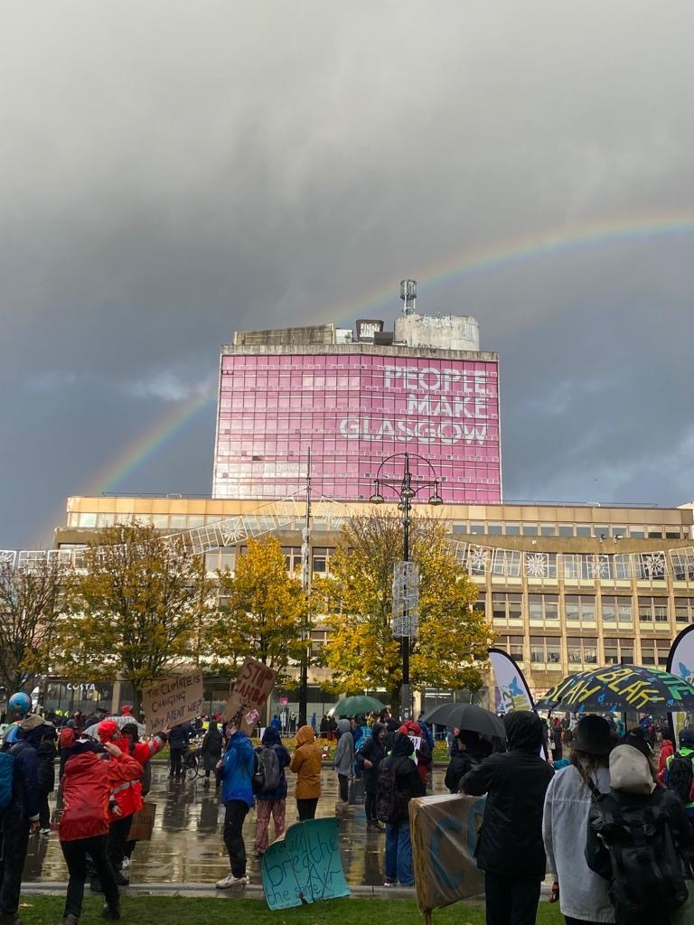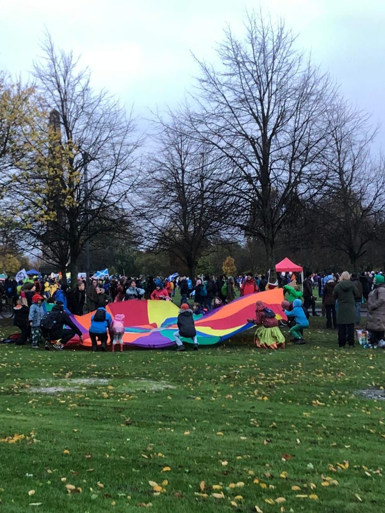 Groups from Glasgow, Edinburgh, Falkirk and Stirling joined the Glasgow Global Day of Action march on 6th November in the pouring rain, which later gave way to a rainbow with the rain eventually stopping in time for the destination, where everyone enjoyed hot chocolate and parachute games. Some children and their families marched two days in a row, having also taken part in the Fridays for the Future school strike the day before.