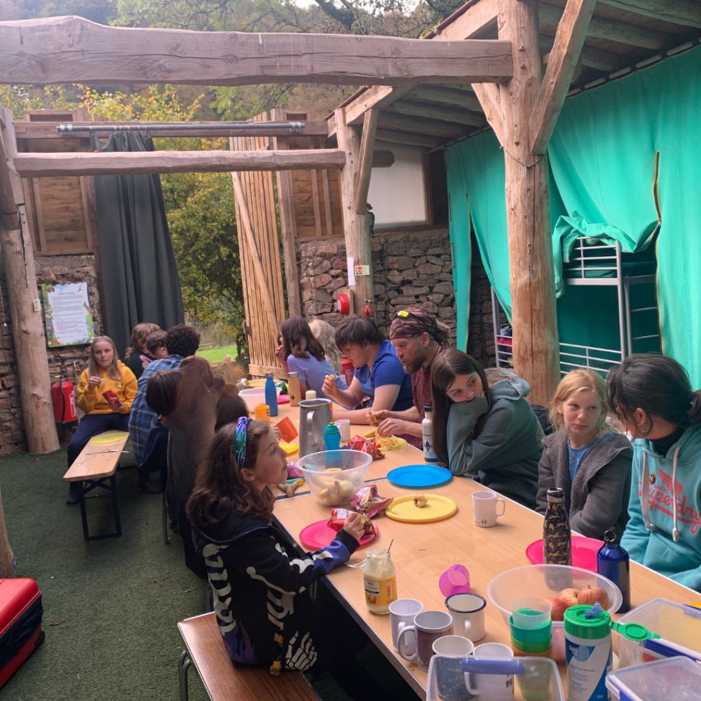 Participants aged 10 – 15 and came from across the country from Leeds, London, Oxford, Banbury, Aberystwyth and Cheltenham to attend the event. The group was made up of experienced Woodcraft Folk members who attend a local group as well as new members of the organisation, for some of which, this was their first experience camping with Woodcraft Folk. The group stayed in the Burrow and on Sunday, the rain held off long enough for the group to eat lunch with the roof open thanks to the buildings retractable roof features!