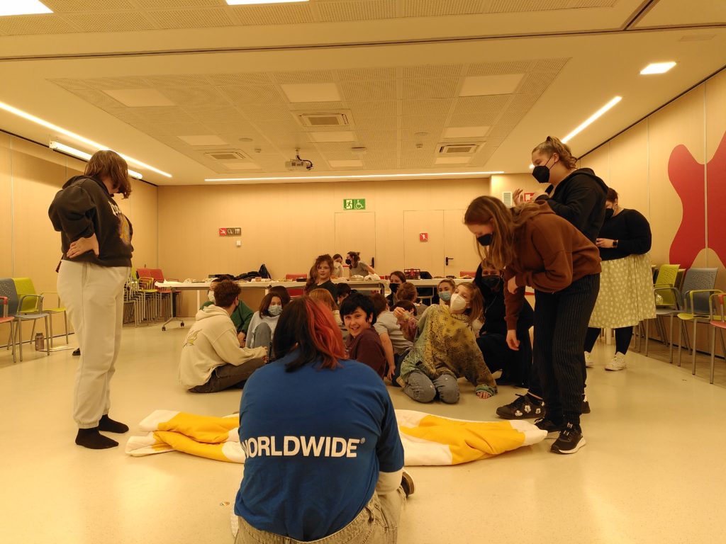 On the second evening, the group took part in an intercultural evening where every organisation shared a snack and a game from their country. The Woodcraft Folk group shared the classic custard cream biscuit and the more controversial snack of twiglets. The Finnish delegation taught the group the ‘blanket game’ which was a fun way to get to know each others names.