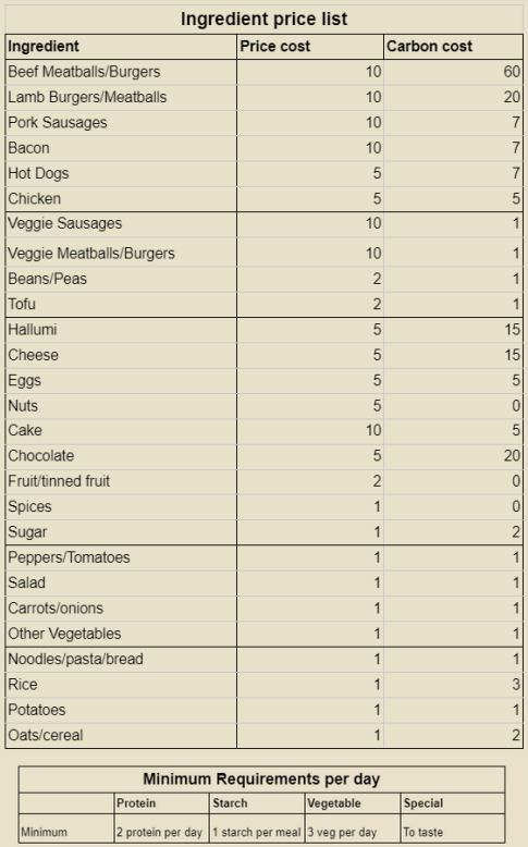 For Venturers we suggest you add the Table of Minimum Requirements per Day. You could reduce food budgets as you go, slightly adjust the money/carbon cost of ingredients based on changes in supply. Feel free to adjust this workshop based on what you think your kids can handle, it can be a simple thought exercise or a complicated puzzle