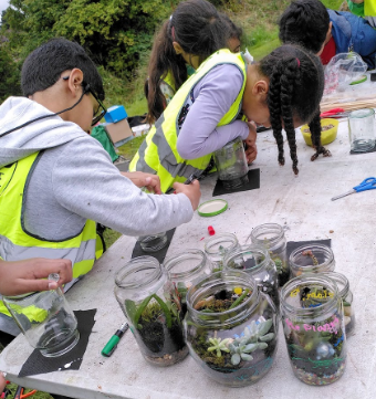 The groups played lots of games and enjoyed outdoor activities like painting raised beds, producing terrariums, creating seed bombs (renamed Seed Samosas), tried a zip line, made fruit faces, used a smoothie bike, built dens, learned some new dances and got stuck into lots of craft and creative projects. Everyone also ate breakfasts and lunches outside together creating a community feel. The young people particularly loved using flint and steel and birch bark to light a spark to start the rocket stove they cooked their lunch on.